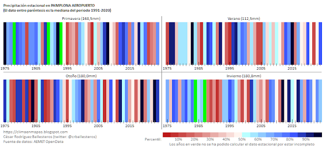 Partiendo de los percentiles del periodo de referencia 1991-2020, he representado con tonos azules los valores superiores al percentil del 50% (mediana de la serie) y en tonos rojos los inferiores. En los gráficos anuales la leyenda de la escala es doble, mostrando tanto el percentil como la precipitación de cada tonalidad, mientras que en los mensuales y en los estacionales, al ser la escala común a los doce meses/cuatro estaciones, sólo se muestra el percentil, incluyéndose entre paréntesis el valor de la mediana.