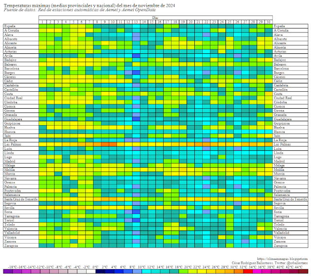 Seguidamente se muestran las temperaturas máximas y mínimas diarias, promediadas por provincias (y para el conjunto del país), del año 2024, y sus anomalías y percentiles respecto al periodo de referencia 1991-2020.