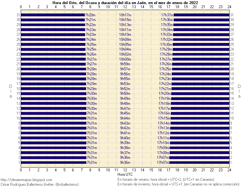 En esta página se muestran los gráficos con las horas de salida y puesta del sol, y la duración del día en las capitales de provincia españolas durante el mes de enero de 2022.