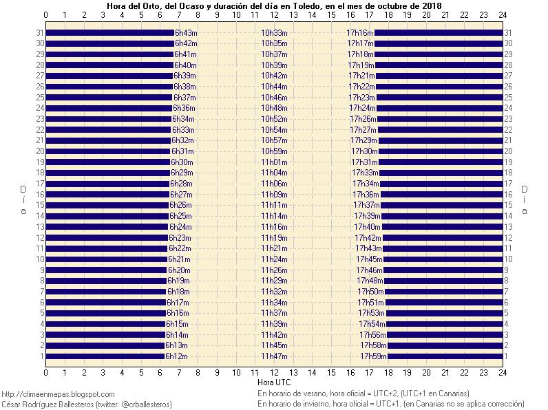En esta página se muestran los gráficos con las horas de salida y puesta del sol, y la duración del día en las capitales de provincia españolas durante el mes de octubre de 2018.