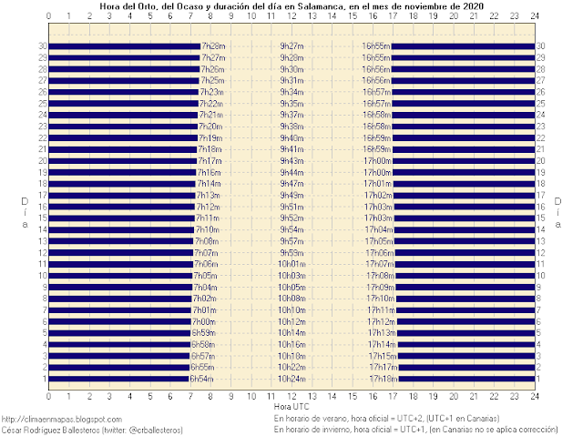 En esta página se muestran los gráficos con las horas de salida y puesta del sol, y la duración del día en las capitales de provincia españolas durante el mes de noviembre de 2020.