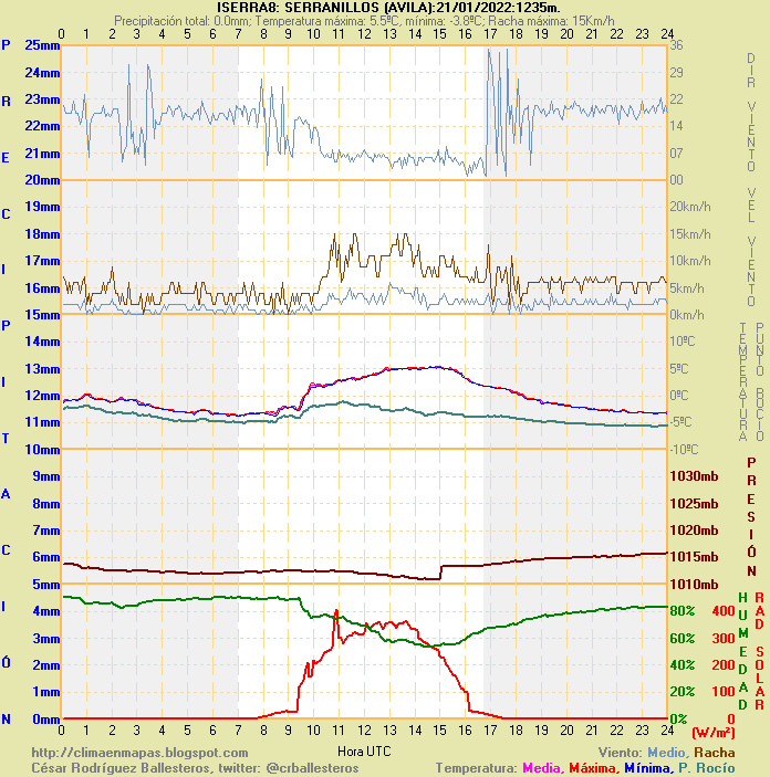 Se muestran seguidamente los gráficos cincominutales de enero de 2022 en la estación de Serranillos.