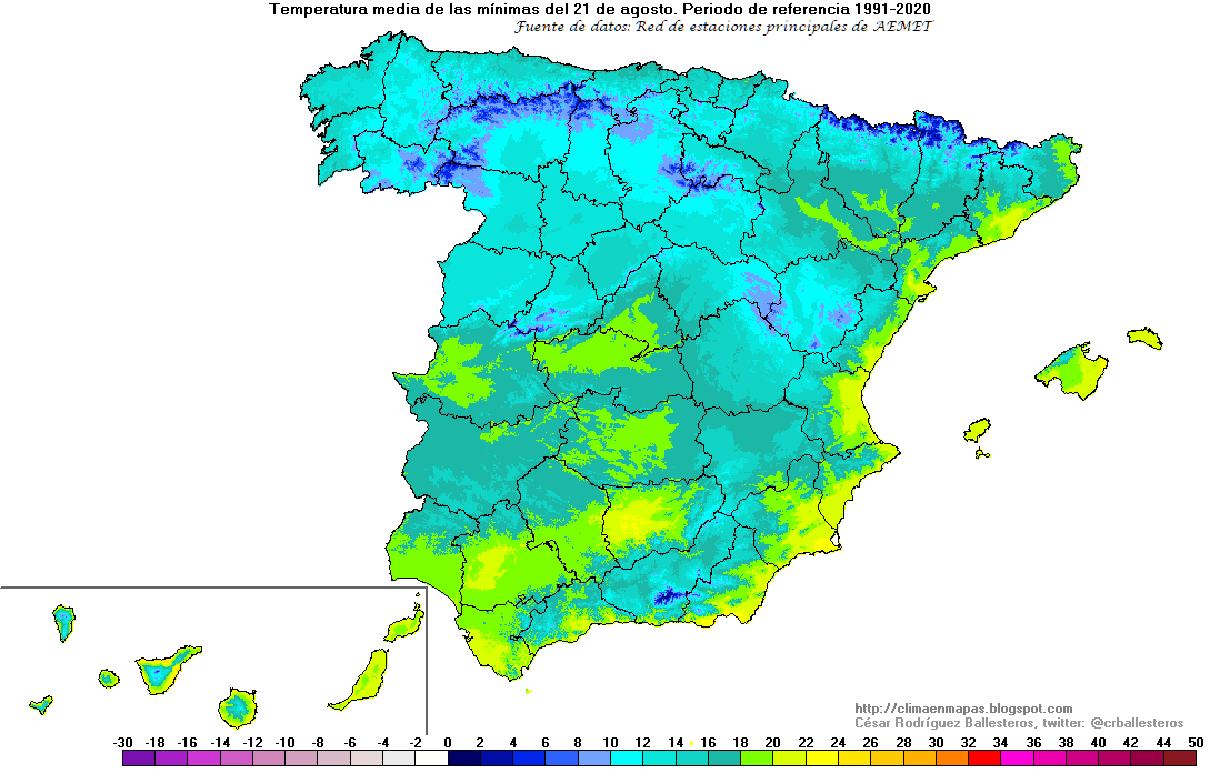 Para generar los mapas, los datos se han interpolados con la inversa de la distancia al cuadrado teniendo en cuenta la variación de la temperatura con la altitud. Es un método sencillo que proporciona buenos resultados, pero evidentemente los valores obtenidos son sólo una estimación de los valores reales y diferirán, en mayor o menor medida, de los hallados por otros métodos y/o con un número mayor de estaciones. Por eso, quienes necesiten más precisión o mapas oficiales deben usar los de AEMET.