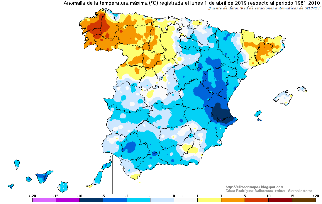 Se muestran a continuación los mapas de temperatura máxima y mínima registradas en abril de 2019, así como sus anomalías respecto al periodo de referencia 1981-2010 y la amplitud térmica resultante. Los mapas con los valores normales están disponibles en el apartado 'Mapas de temperaturas medias diarias periodo 1981-2010' de este enlace del blog