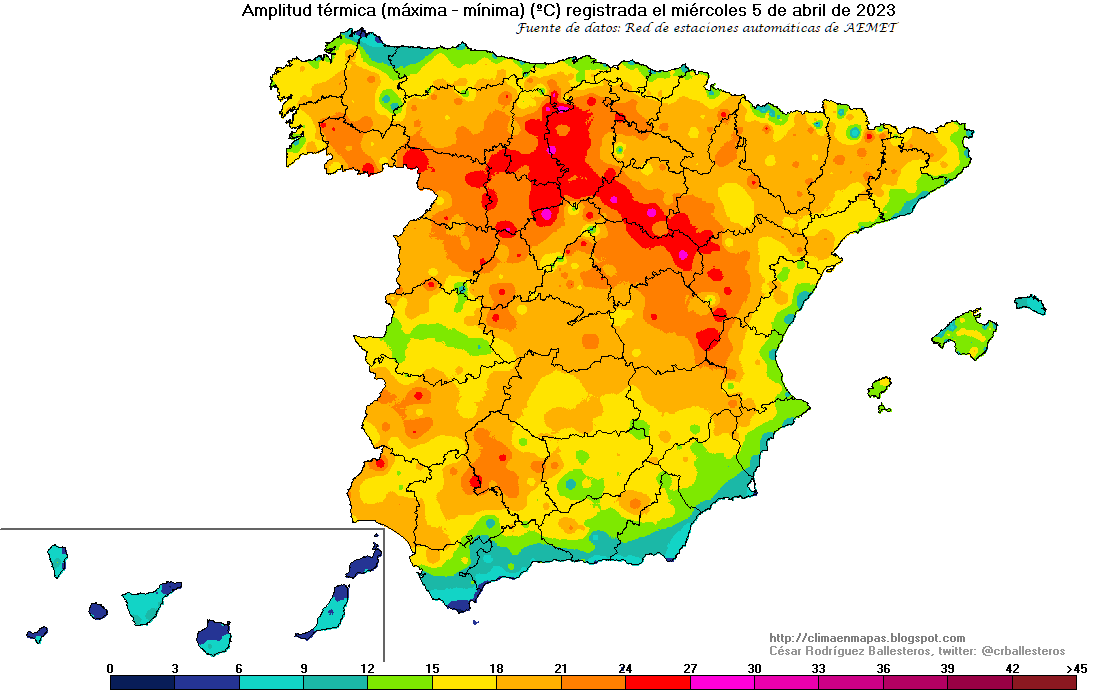 Se muestran a continuación los mapas de temperatura máxima y mínima registradas en abril de 2023, así como sus anomalías y el percentil respecto al periodo de referencia 1991-2020 y la amplitud térmica resultante. Son mapas que complementan los de anomalías, ya que estos últimos indican la diferencia con el valor medio de dicho periodo, pero no sirven para saber si son valores frecuentes o infrecuentes; es para juzgar esto último para lo que he añadido los nuevos mapas de percentil: por ejemplo, un percentil del 95% querría decir que sólo el 5% de los valores del periodo de referencia han sido superiores.