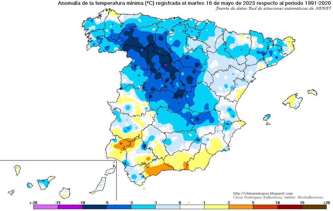 Se muestran a continuación los mapas de temperatura máxima y mínima registradas en mayo de 2023, así como sus anomalías y el percentil respecto al periodo de referencia 1991-2020 y la amplitud térmica resultante. Son mapas que complementan los de anomalías, ya que estos últimos indican la diferencia con el valor medio de dicho periodo, pero no sirven para saber si son valores frecuentes o infrecuentes; es para juzgar esto último para lo que he añadido los nuevos mapas de percentil: por ejemplo, un percentil del 95% querría decir que sólo el 5% de los valores del periodo de referencia han sido superiores.