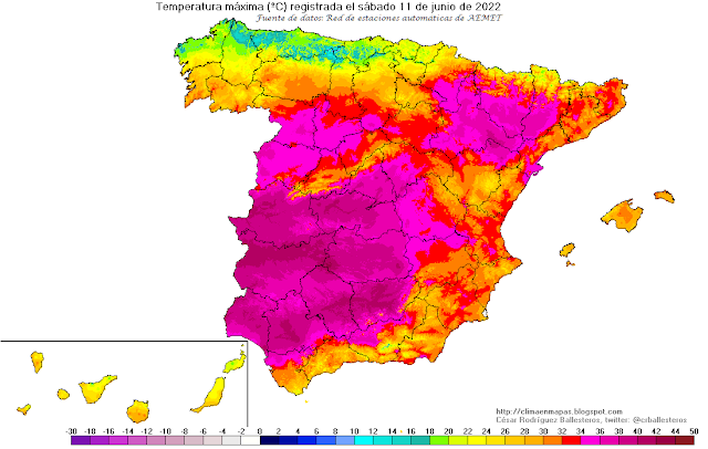Se muestran a continuación los mapas de temperatura máxima y mínima registradas en junio de 2022, así como sus anomalías y el percentil respecto al periodo de referencia 1991-2020 y la amplitud térmica resultante. Son mapas que complementan los de anomalías, ya que estos últimos indican la diferencia con el valor medio de dicho periodo, pero no sirven para saber si son valores frecuentes o infrecuentes; es para juzgar esto último para lo que he añadido los nuevos mapas de percentil: por ejemplo, un percentil del 95% querría decir que sólo el 5% de los valores del periodo de referencia han sido superiores.