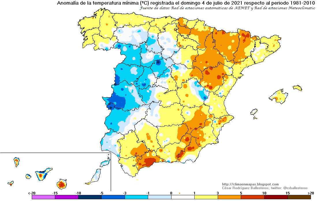 Se muestran a continuación los mapas de temperatura máxima y mínima registradas en julio de 2021, así como sus anomalías respecto al periodo de referencia 1981-2010 y la amplitud térmica resultante. Desde el 24 de julio de 2019 se incluyen también los mapas con el percentil de las temperaturas máximas y mínimas respecto del periodo de referencia 1981-2010. Son mapas que complementan los de anomalías, ya que estos últimos indican la diferencia con el valor medio de dicho periodo, pero no sirven para saber si son valores frecuentes o infrecuentes; es para juzgar esto último para lo que he añadido los nuevos mapas de percentil: por ejemplo, un percentil del 95% querría decir que sólo el 5% de los valores del periodo de referencia han sido superiores.