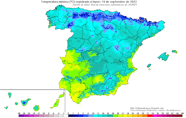 Se muestran a continuación los mapas de temperatura máxima y mínima registradas en septiembre de 2022, así como sus anomalías y el percentil respecto al periodo de referencia 1991-2020 y la amplitud térmica resultante. Son mapas que complementan los de anomalías, ya que estos últimos indican la diferencia con el valor medio de dicho periodo, pero no sirven para saber si son valores frecuentes o infrecuentes; es para juzgar esto último para lo que he añadido los nuevos mapas de percentil: por ejemplo, un percentil del 95% querría decir que sólo el 5% de los valores del periodo de referencia han sido superiores.