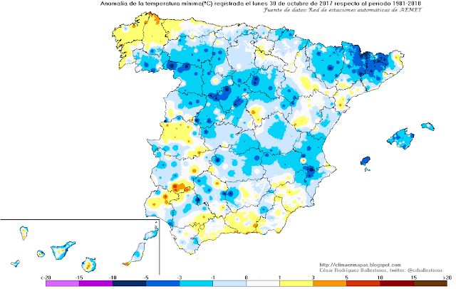 Se muestran a continuación los mapas de temperatura máxima y mínima registradas en octubre de 2017, así como sus anomalías respecto al periodo de referencia 1981-2010 y desde el 27 de octubre también se representa la amplitud térmica. Los mapas con los valores normales están disponibles en el apartado 'Mapas de temperaturas medias diarias periodo 1981-2010' de este enlace del blog