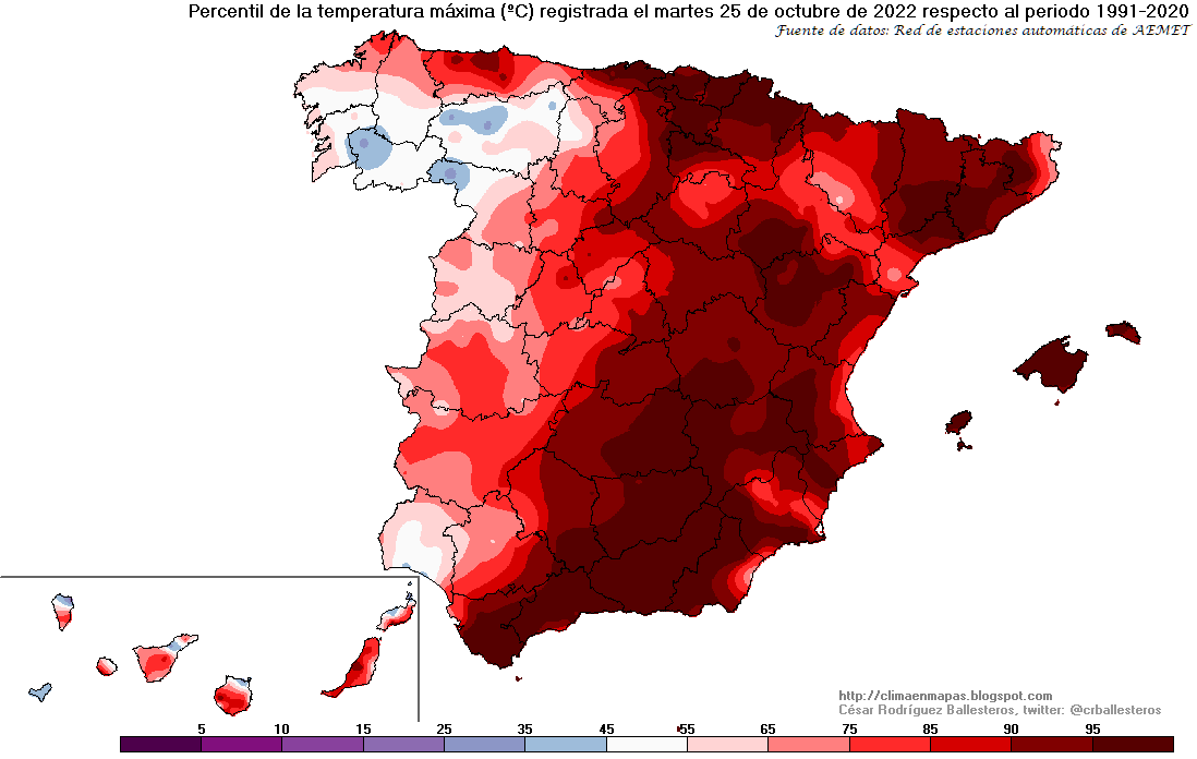 Se muestran a continuación los mapas de temperatura máxima y mínima registradas en octubre de 2022, así como sus anomalías y el percentil respecto al periodo de referencia 1991-2020 y la amplitud térmica resultante. Son mapas que complementan los de anomalías, ya que estos últimos indican la diferencia con el valor medio de dicho periodo, pero no sirven para saber si son valores frecuentes o infrecuentes; es para juzgar esto último para lo que he añadido los nuevos mapas de percentil: por ejemplo, un percentil del 95% querría decir que sólo el 5% de los valores del periodo de referencia han sido superiores.