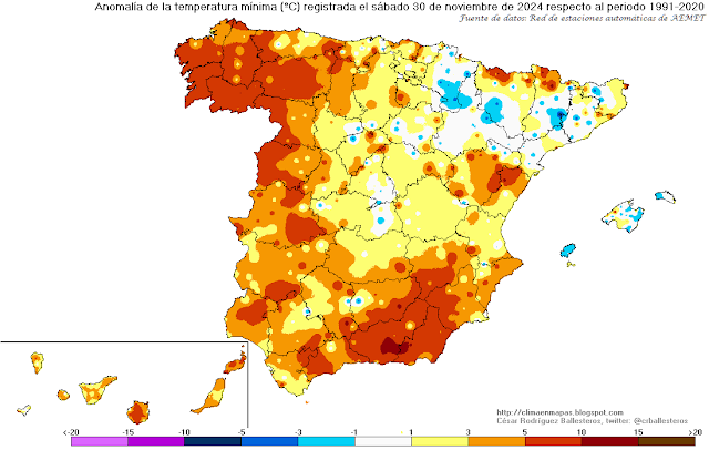 Se muestran a continuación los mapas de temperatura máxima y mínima registradas en noviembre de 2024, así como sus anomalías y el percentil respecto al periodo de referencia 1991-2020 y la amplitud térmica resultante. Son mapas que complementan los de anomalías, ya que estos últimos indican la diferencia con el valor medio de dicho periodo, pero no sirven para saber si son valores frecuentes o infrecuentes; es para juzgar esto último para lo que he añadido los nuevos mapas de percentil: por ejemplo, un percentil del 95% querría decir que sólo el 5% de los valores del periodo de referencia han sido superiores.